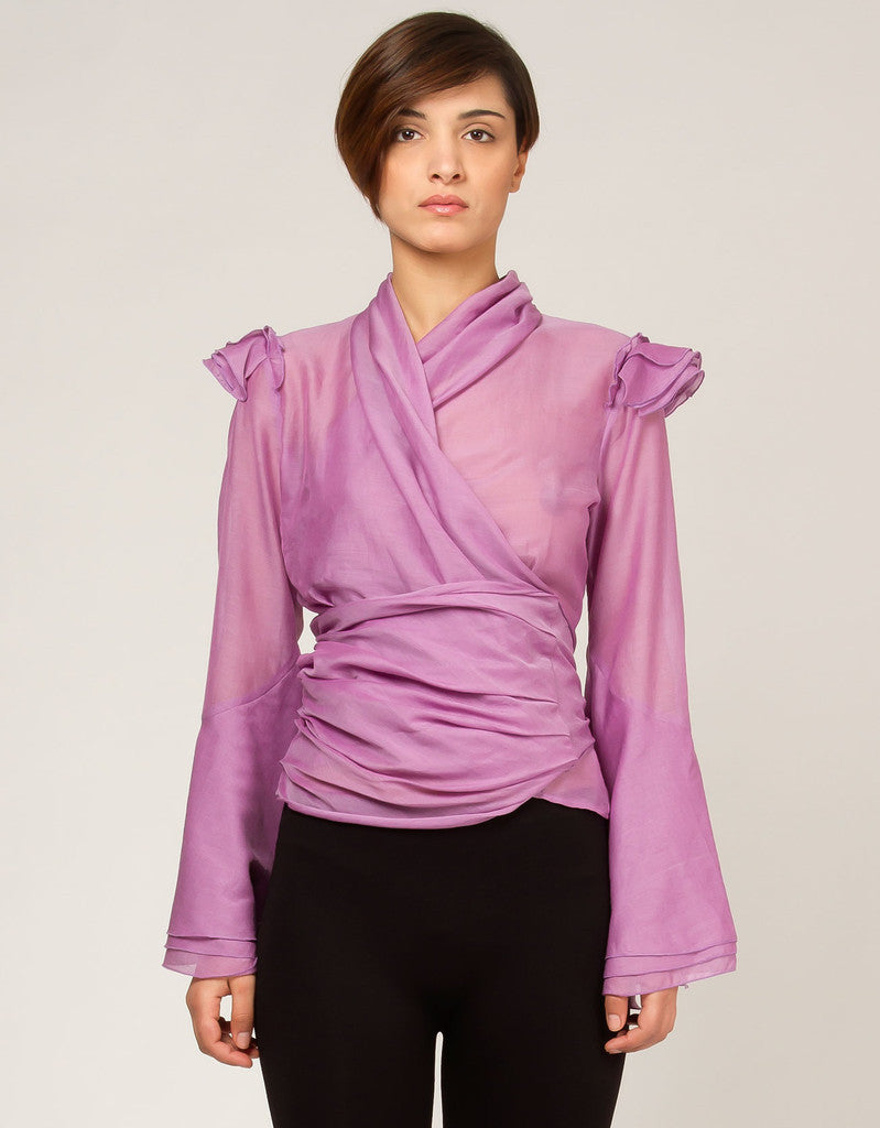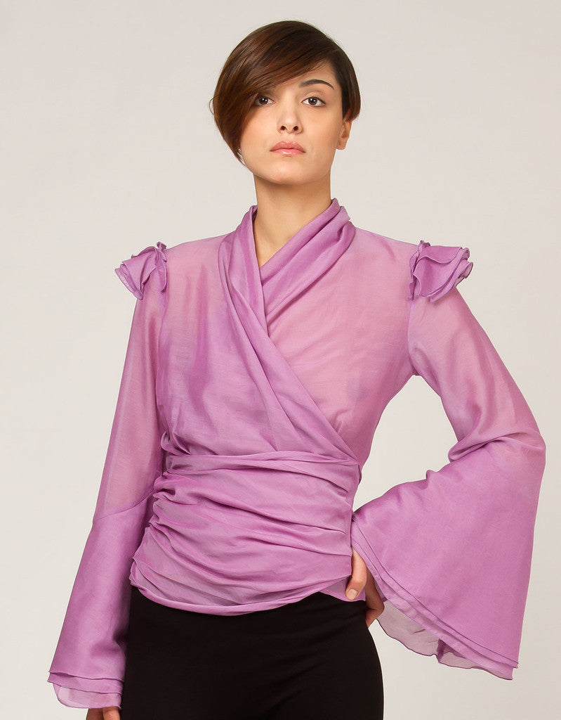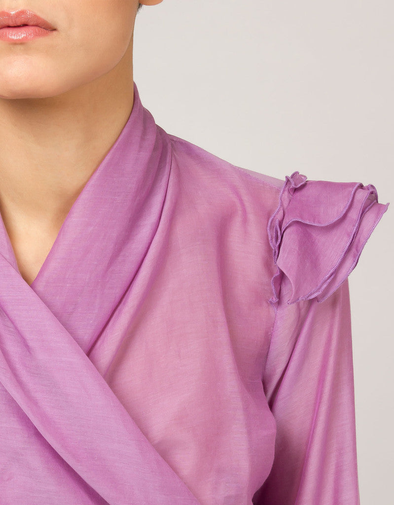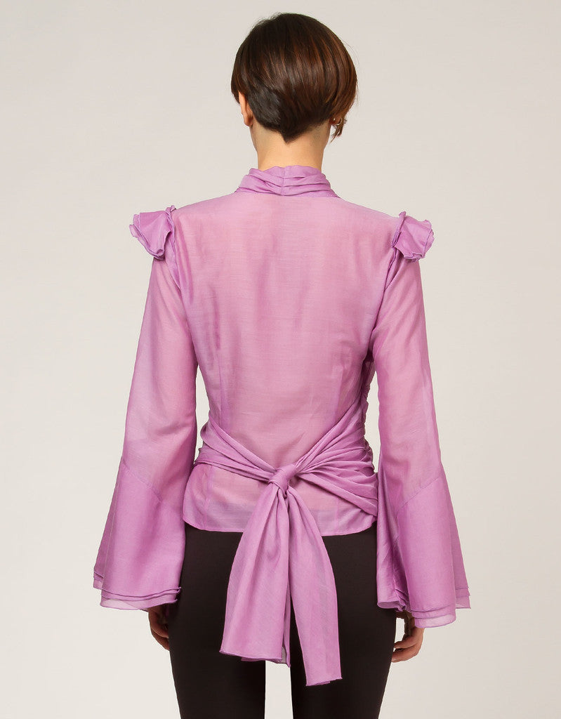 Blouse made of silk and cotton. Featuring fluted sleeves with little low-cap sleeves on the shoulders. A soft band to cross on the front and to fasten on the back.