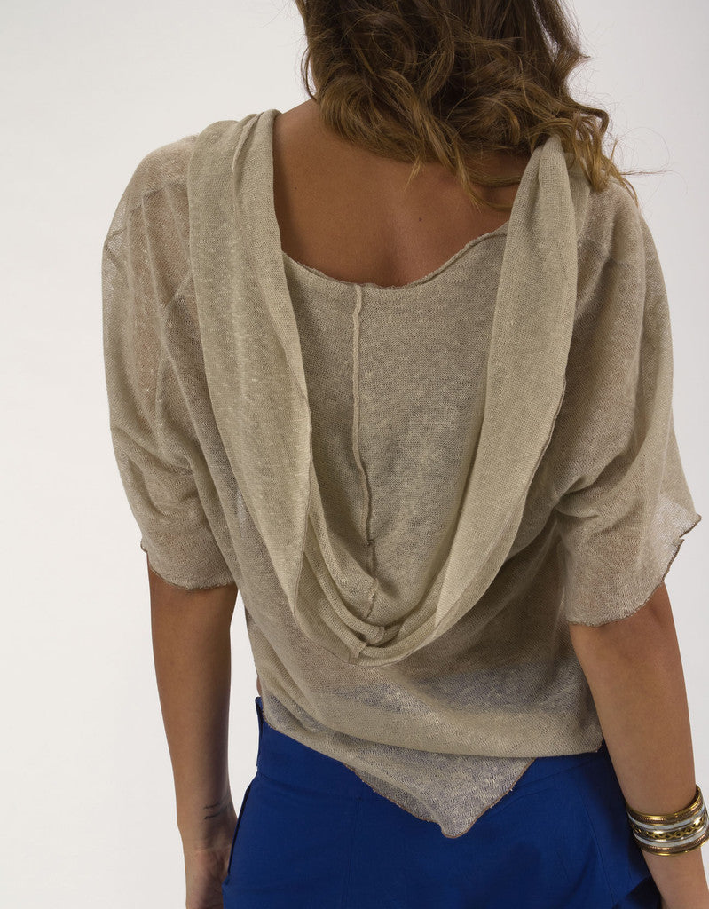 Wide flared shirt with short sleeves. Model with point cutting on the front and on the rear. Soft and wide hood.